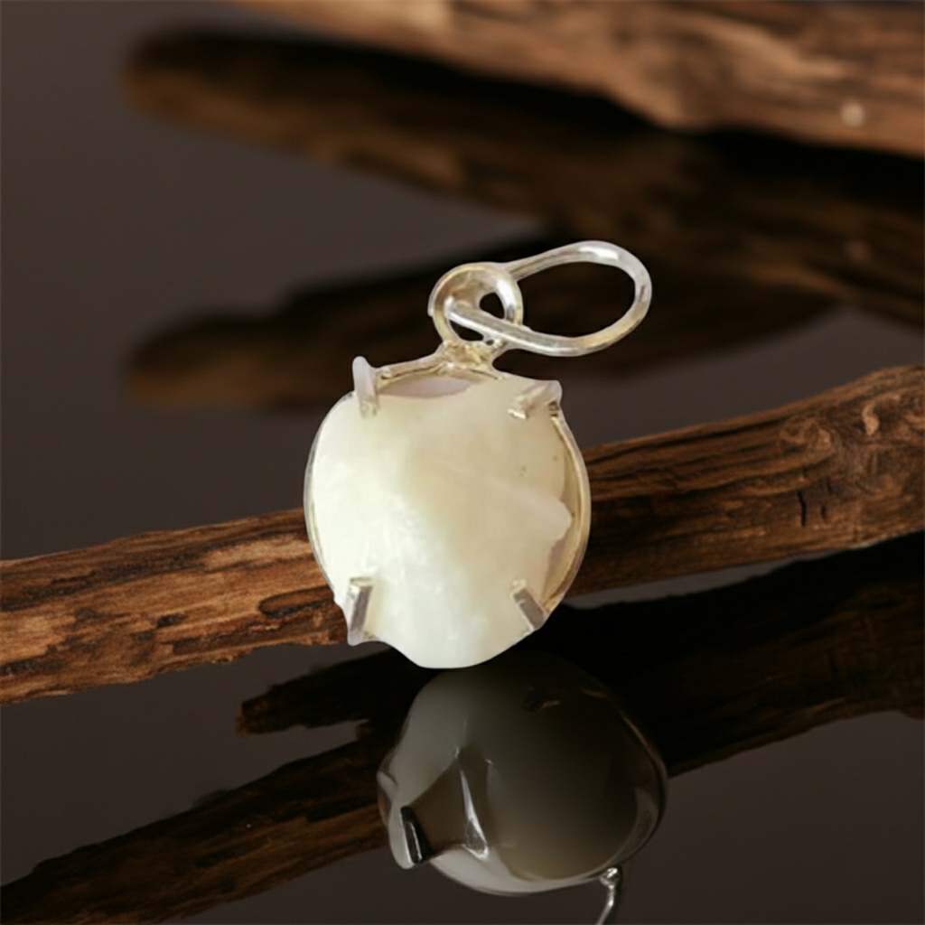 Genuine Machh Mani locket stones exhibit distinctive natural qualities that set them apart from imitations. Authentic Machh Mani displays a soft, luminous glow with an opalescent sheen reminiscent of a fish’s eye. The color typically ranges from natural white to off-white or subtle brownish tones, with natural inclusions and an uneven, organic texture that confirms authenticity.