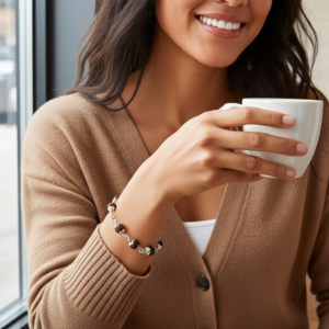 Feel the Mala’s Energy: Gently touch the cool beads, allowing their calming energy to anchor you in the present moment.